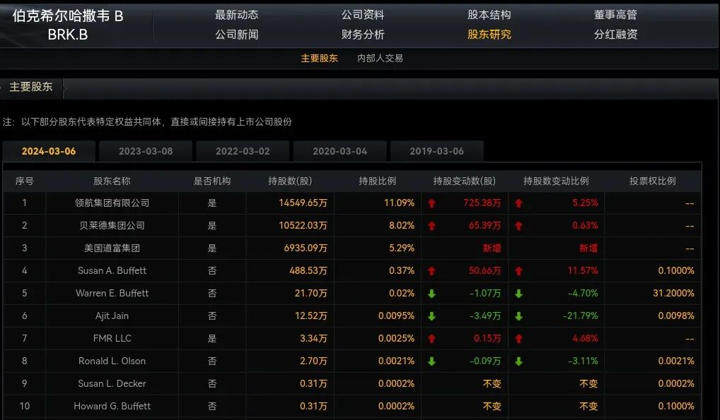 伯克希尔·哈撒韦公司的三大股东丝毫不出意外,又是先峰领航、贝莱德、道富三大投资集团,占比24.4%,而巴菲特家族只占0.39%。