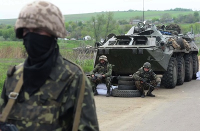 在斯拉维扬斯克郊外一村庄附近的乌克兰军队,当地居民封锁了乌克兰军队装甲运兵车车队 图源:Sputnik