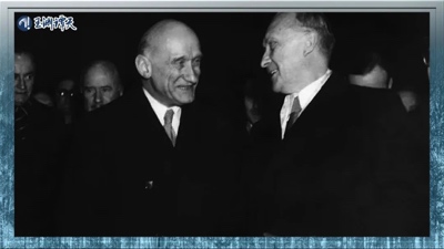 1950年,时任德国总理阿登纳(右)接待来访的法国外交部长舒曼(左),战后法德和解,就煤钢生产及储备达成一致,是欧洲煤钢共同体得以成立的基础
