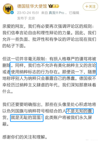 前两天,@德国驻华大使馆 先是说“信奉言论自由和理性辩论的力量”,接着又说“有损人格尊严的谩骂将被删除”,但恕我直言,@德国驻华大使馆 多少给人说一套做一套的感觉,要不为什么一边说“有损人格尊严的谩骂将被删除”,一边又骂别人是“无知的蠢货”和“无耻的混蛋”呢?