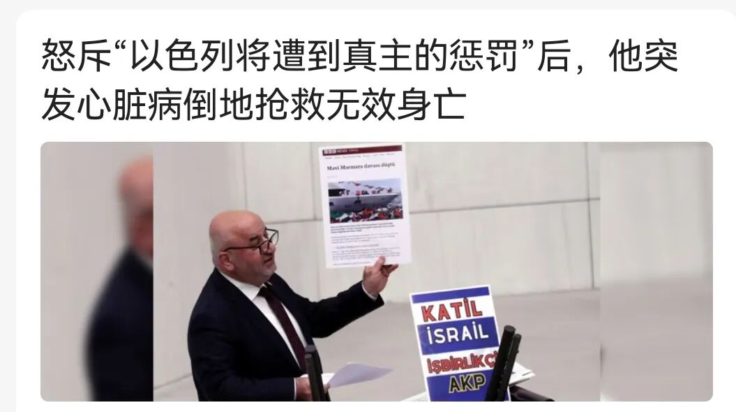 土耳其从埃尔多安到民间政治人物,无不在各种场合发声痛骂谴责以色列。现在比特梅兹在议会批评以色列的时候,众目睽睽之下倒地“心脏病意外”身亡,还有什么比这个更强烈的“警告”呢?