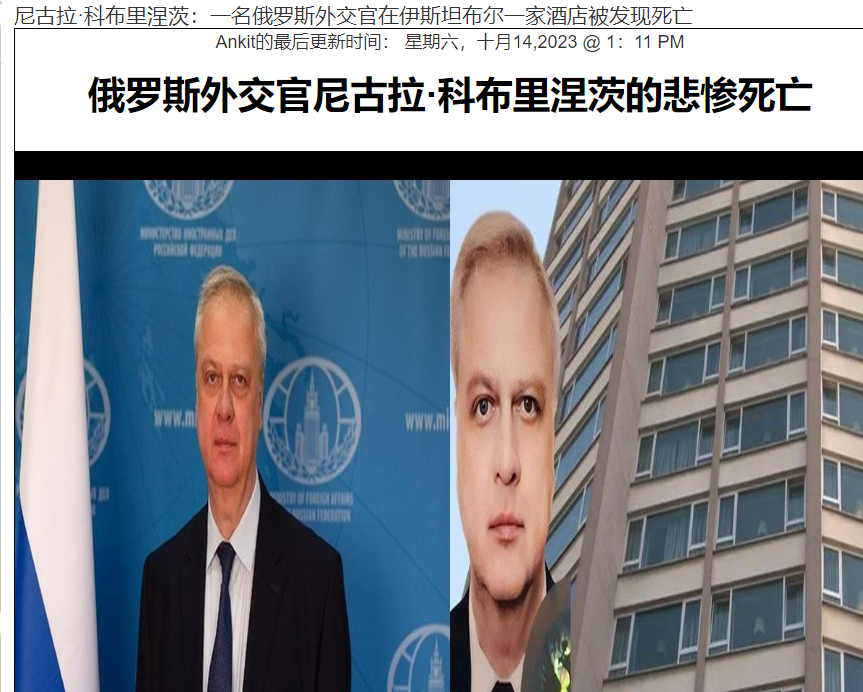 10月14日,伊朗、土耳其等中东地区多家媒体报道,俄罗斯外交部泛欧合作司司长尼古拉·科布里涅茨,因没有出席预订的多国大使峰会,被发现死在土耳其伊斯坦布尔塔克西姆区一家酒店床上。土耳其调查之后,与俄罗斯官方一起定性为“心脏病”。科布里涅茨的同事和家人表示“震惊”,称平时他身体健康......