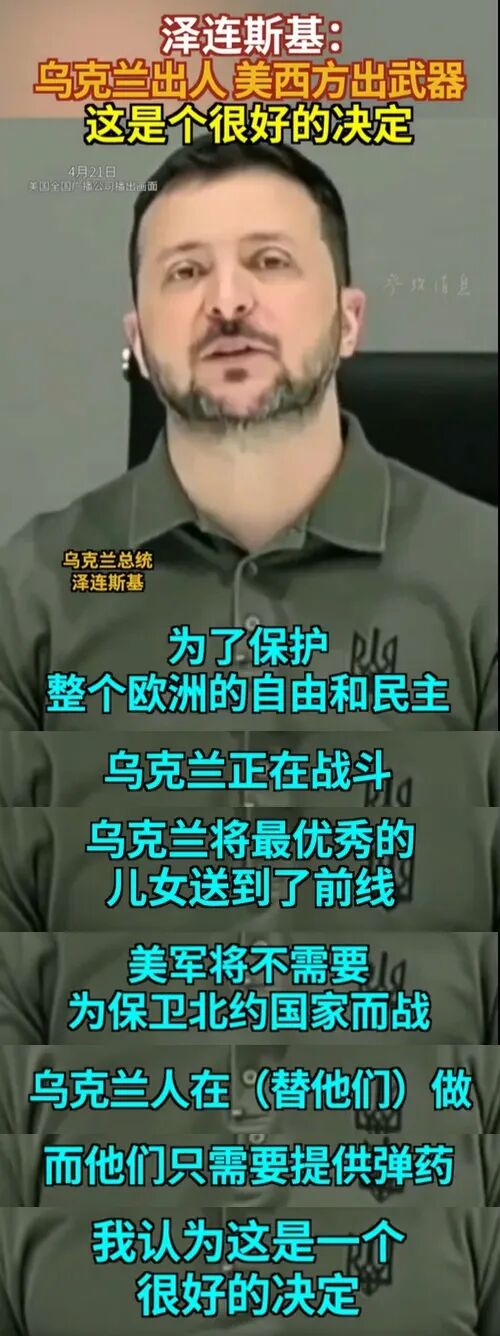 4月,乌克兰总统泽连斯基在接受美国媒体采访时扬言,美国只用向基辅提供武器,而乌克兰人却在战场上为北约国家作战,这是一个“很好的决定”。