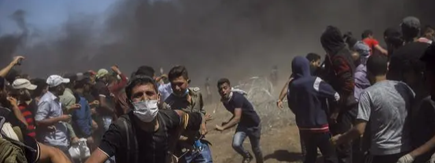 这是在约旦河西岸,那些声援加沙同胞的巴勒斯坦人,他们在和以色列军警发生冲突后,四散奔跑的混乱场面。