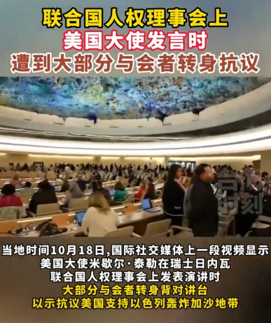 这几天发生的很多事情简直可以载入史册,你可以清楚地看到人心向背,美国代表米歇尔·泰勒在人权委员会上发表演讲时,大多数与会者都背身表示抗议。