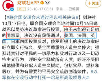 然而,对于以色列的暴行,伪善的西方国家并没有说“今夜我们都是巴勒斯坦人”,更没有说“人权高于主权”,在昨天联合国安理会就巴以局势决议的草案未能获得通过,请记住投反对票的国家的名字:美国、法国、英国、日本,它们都是以色列屠杀巴勒斯坦人的帮凶。