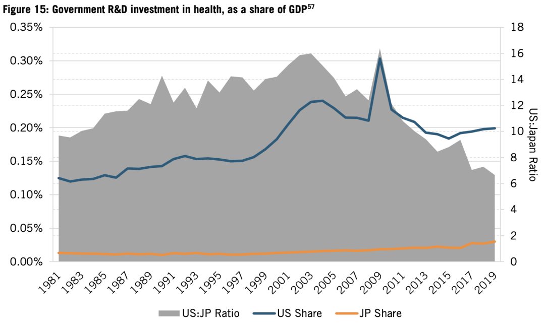 日本政府一直在为生物技术研究提供资金。但随着时间推移,政府投入停滞不前,无论是绝对数额,还是GDP占比,都从未达到过美国等竞争对手的水平。梅村指出:20世纪80年代,科技厅、通产省和农林水产省等政府机构为生物技术研究项目提供资金,但仅达到美国政府投资的十分之一。日本医药研发资助占所有政府研发资助比例,1998年为2.6%,至2020年,小幅增加到4%。而美国则是从12%增加到27%。(见图15)。