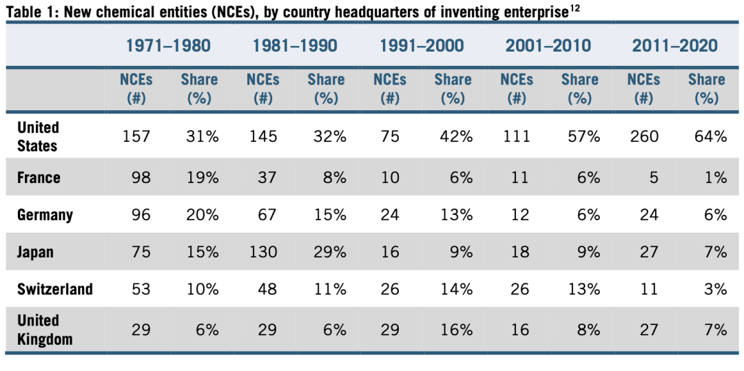 创新方面,日本的制药业在20世纪80年代达到顶峰。年代初期,日本制药公司开始追平欧洲竞争对手。1980年至1984年,全球主要新药中,日本研发占比16%,而德国占15%、瑞士占13%。十年间,日本发现的新化学单体(NCE)达到130个,占该时期全球发现的29%,几乎全部是新药。同时,日本NCE产值占GDP比重高于美国。