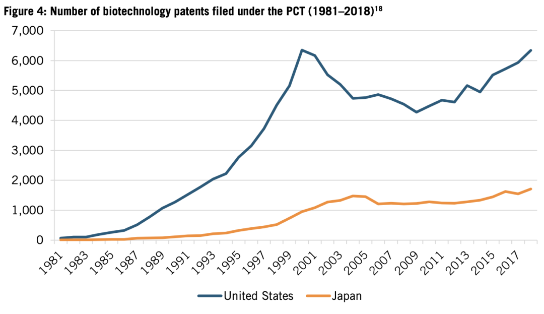 从1980年代初开始,生命科学创新的基础逐渐从化学制药转向生物技术只要,美国和日本生物技术专利申请数量出现巨大差距。1984年以前,两国生物技术专利申请数都不到200件,但到1999年,美国的申请数达到日本的10倍(5514件对521件,见图4)。