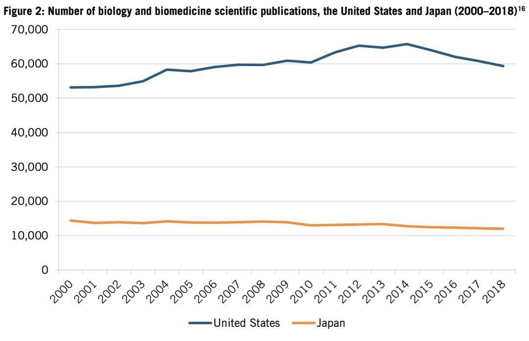 投资下降,导致日本生物学和生物医学的成果发表,生物技术和生物制药的专利申请,产出双双下降。2000年到2018年,日本研究人员发表的科研成果下降了16.5%,从14379篇下降到12001篇。而美国的数据增加了约10%(见图2)。