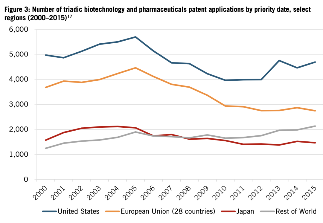发表下降进而导致专利申请减少。从2000年到2015年,根据《专利合作条约》(PCT)提交的日本三元生物合成物(译注:指利用生物技术,将三种或以上物种的基因合成为一种物质进行表达的技术)和药品专利申请数量下降了7%(见图3)。