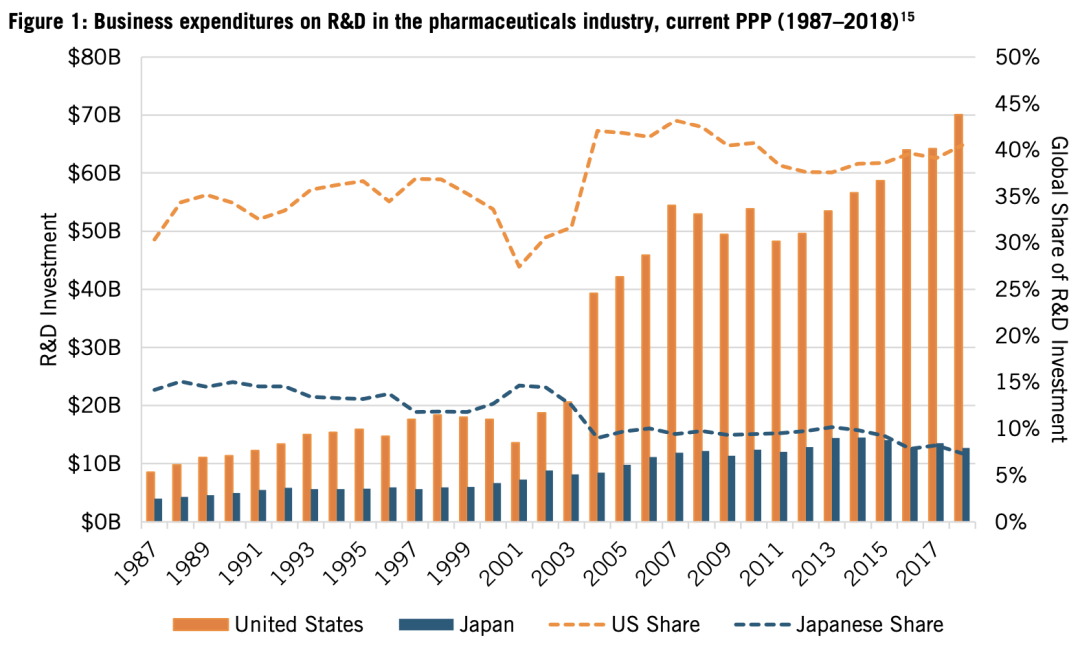 药品研发方面,1987年,美国公司的药品研发投资总额,按当前购买力平价(PPP)计算为41亿美元,日本为19亿美元。但计算投资占GDP的比重,日本的数据要高于美国(0.055% 对0.046%)。随后二十年中,两国研发投资差距逐步扩大。到2018年,美国制药公司的研发投资是日本公司的5.5倍(745亿美元对135亿美元)。在全球药品研发投资占比中,日本从1987年的14.1%下降到2018年的7.3%,而美国从30%增加到40%(见图1)。