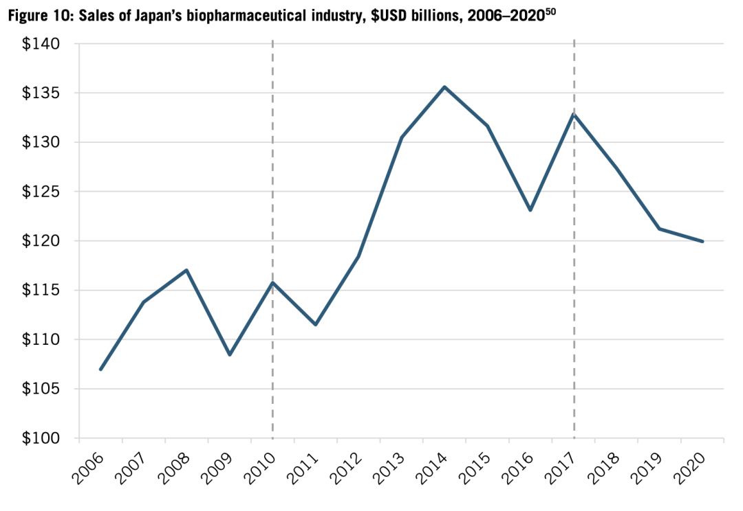 最后,日本缺乏支持生物制药产业的一致愿景。在社会迅速老龄化的背景下,日本财务省高度关注卫生系统的成本管理,尤其是药品价格控制。2016年至2018年,社会保障支出的减少32亿美元,超过80%是通过药品降价实现的。