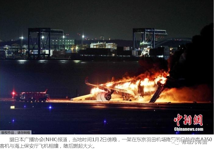 新年第二天傍晚,一架海上保安厅飞机原定飞往石川县地震灾区运送救援物资,却和一架日本航空客机相撞,保安厅飞机上5人丧生,1人重伤,客机上14人受伤。